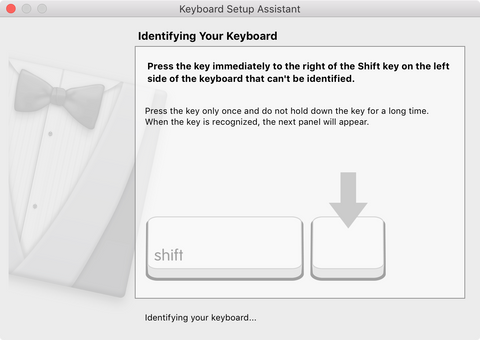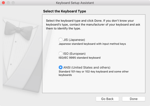 The keyboard identification wizard determines which of the three standard keyboard layouts the keyboard employs: ISO (European), ANSI (American), or JIS (Japanese).